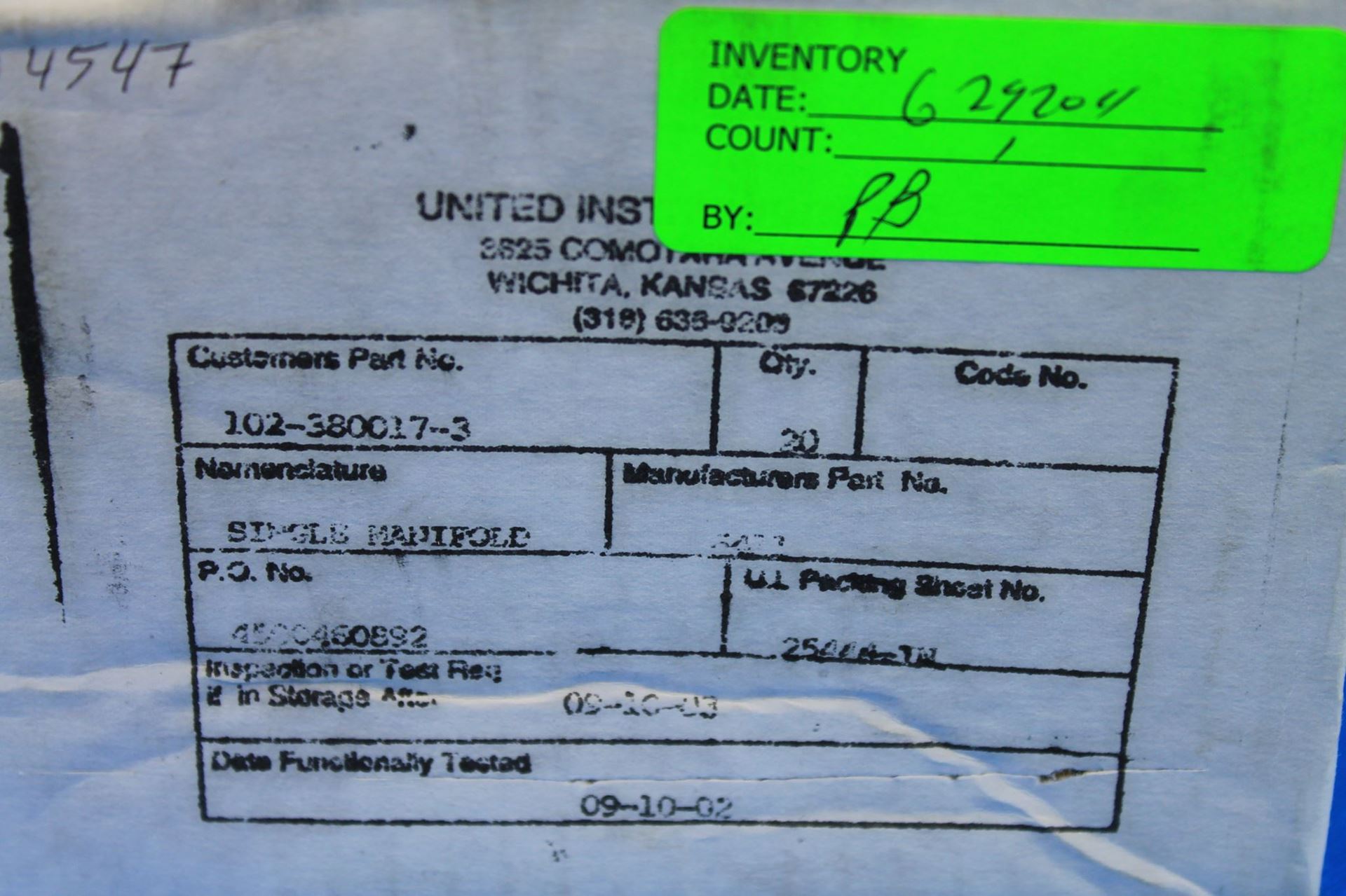 New Old Stock United Instruments Manifold Press Ind P/N: 102-380017-3 (21654)BH
