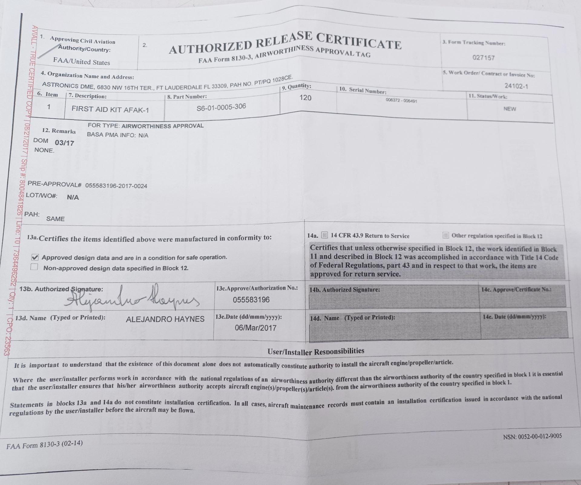 Includes FAA Form 8130-3, dated 03/06/2017