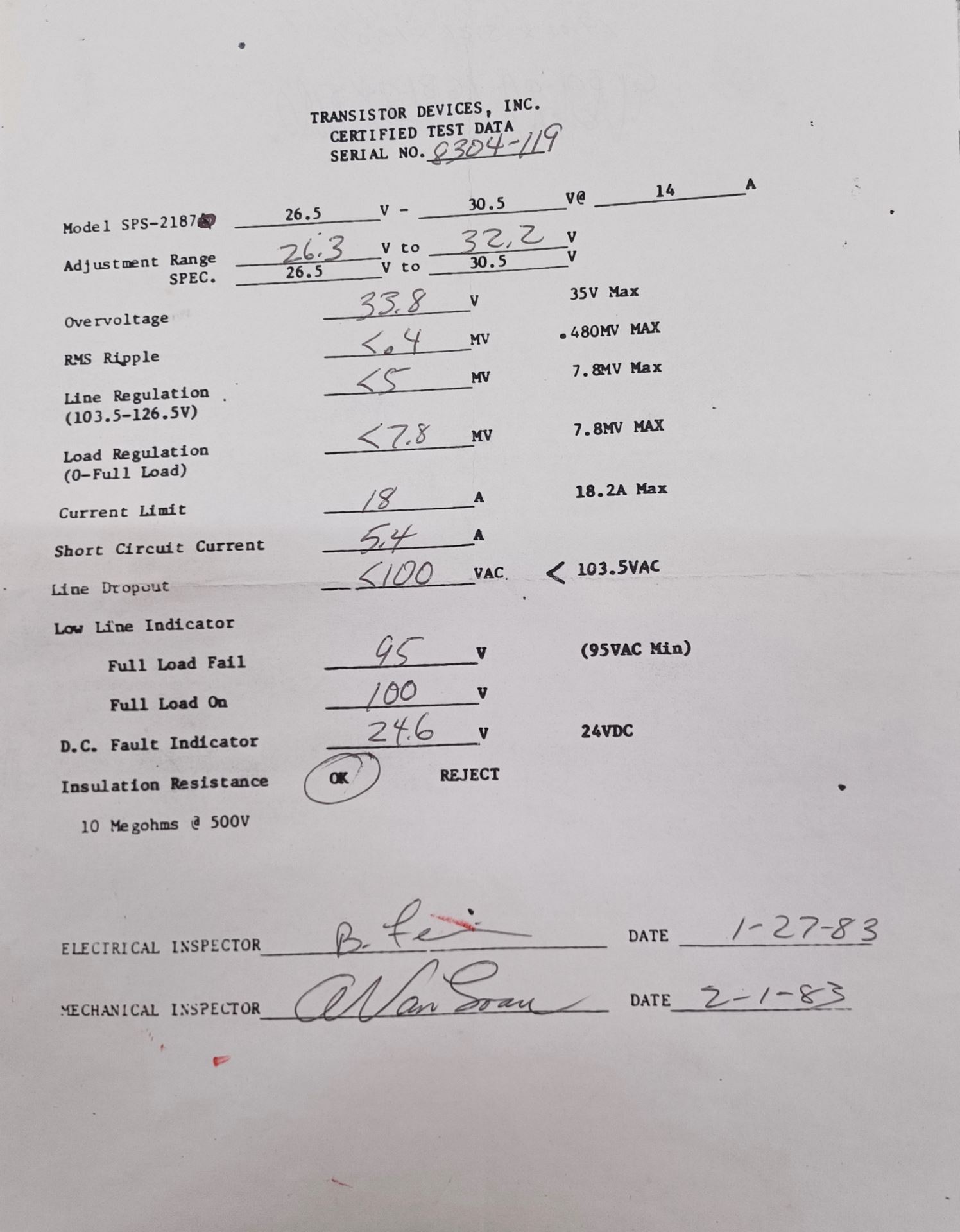 Includes Certified Test Data sheet from 1983, as pictured.