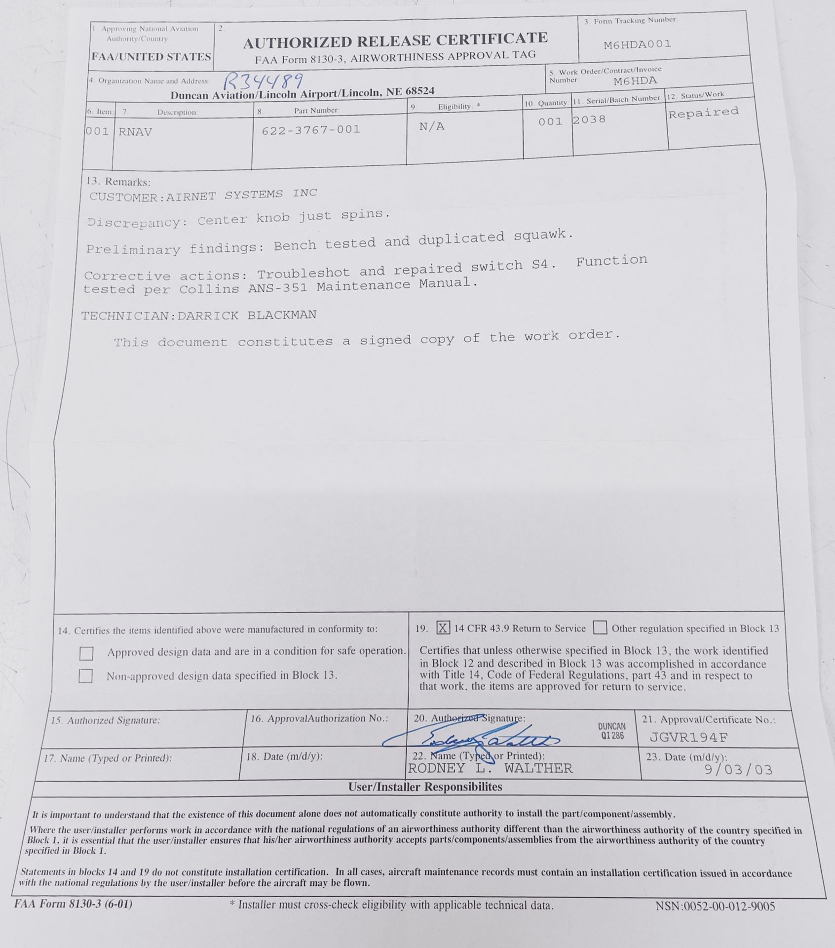 Includes FAA Form 8130-3 for repair, dated 09/03/03