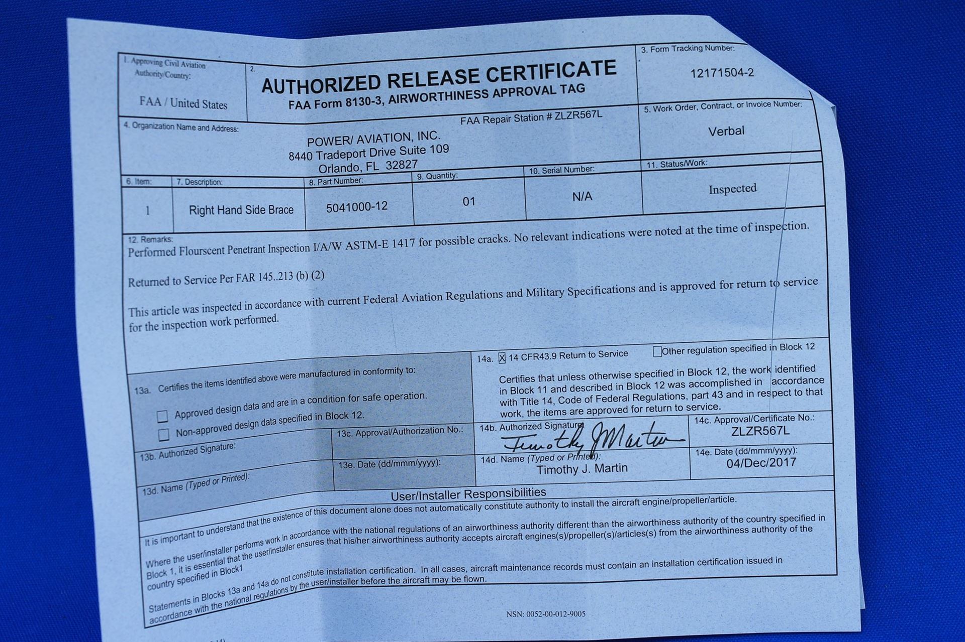 Serviceable Cessna Right Side Brace Assembly w/ 8130 P/N: 5041000-12 (21335)
